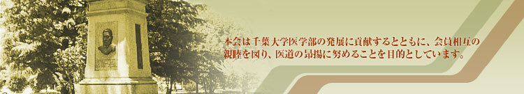 本会は千葉大学医学部・大学院医学研究院および医学部附属病院と緊密な関連を保ちその発展に貢献するとともに、会員相互の親睦を図り、あわせて広く医道の昂揚に努めることを目的としています。